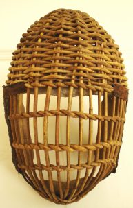The more robust fencing associated with singlestick and bayonet led to the development of a helmet design made either of stout wire with buffalo hide covering or of cane. The former was considered superior as the hand-woven cane helmet [Fig. 12] was apt to give way before a stout thrust and “let in the enemy's point to the detriment of eyes and complexion”.