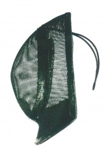 Although a machine-made square mesh was introduced in England, many still preferred the traditional French model5. The need for a bib attached to the mask for added protection was mentioned as early as 18886, but it was not until competitions became commonplace in the early 20th century that bibs became a normal part of mask construction. In 1910 Souzy & de Lacam patented a stronger steel sheet mask pierced by 2 mm holes 3 mm apart.