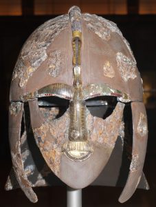 Another extraordinary helmet, dating from AD600, was found at the Sutton Hoo ship-burial site. It includes a face mask with eye sockets, eyebrows and a nose which has two small holes cut in it to allow the wearer to breath freely [Fig. 2].