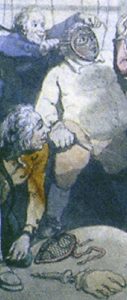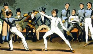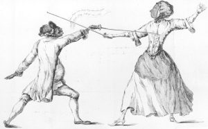 The French fencing master Texier de la Boëssière is generally credited with inventing the wire mask in the mid-18th century, although an encyclopedia of 1755 asserts that masks were not generally used except by beginners since good fencers had no need of them. Angelo forbade their use in his academy and his son Harry recalled1 that, while studying in Paris in 1773, he fenced with Lord Mazarene, “without a mask… when I swallowed some inches, button and all, of my noble opponent’s foil”. That year a caricature of the Duchess of Queensbury fencing with her servant was drawn by William Austin, in which she is shown wearing a face-shaped wire mask [Fig. 4].