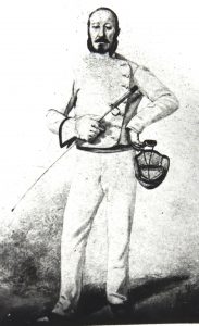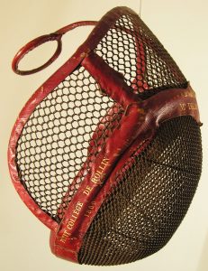 Epeeists required a more substantial mask and a model with integral wire bib was developed in the third quarter of the 19th century [Fig. 10], superseded before the end of the century by the more flexible padded bib type.